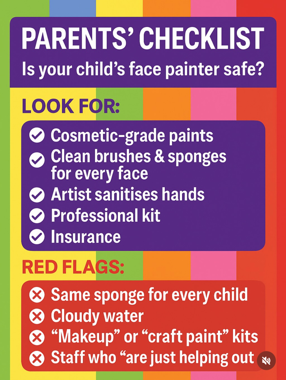 Face paints must be professional grade, hypoallergenic; sourced from professional manufacturers and suppliers. There are many paints available which mimic professional paints but are not in compliance with international standards for cosmetics. They can contain dangerous preservative chemicals and even heavy metals!